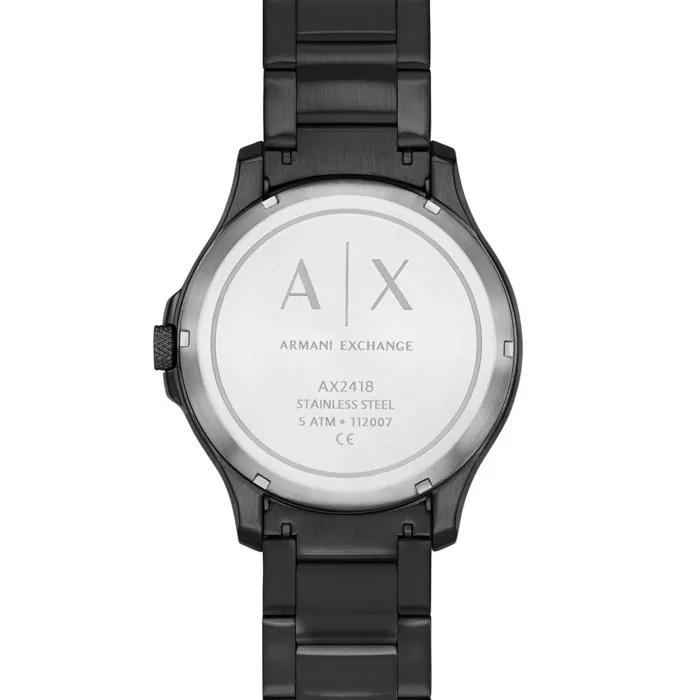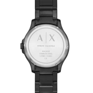 The HAMPTON AX2418, part of the Armani Exchage collection, is a black watch with Miyota 82S0 automatic movement. The watch has a stainless steel case and bracelet, and under the mineral glass you can see the 21-jewel movement with a 42-hour power reserve from the bullseye dial. The case is 46 mm wide and the bracelet attachment point is 22 mm wide. Armani watches are guaranteed for 2 years and come in the original manufacturer’s box.